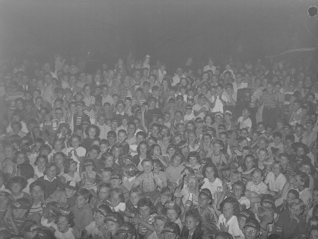 Des enfants sont rassemblés au terrain de jeux de Notre-Dame-de-Grâce à Montréal. Nous remarquons que plusieurs enfants portent une visière avec la mention publicitaire Coca-Cola