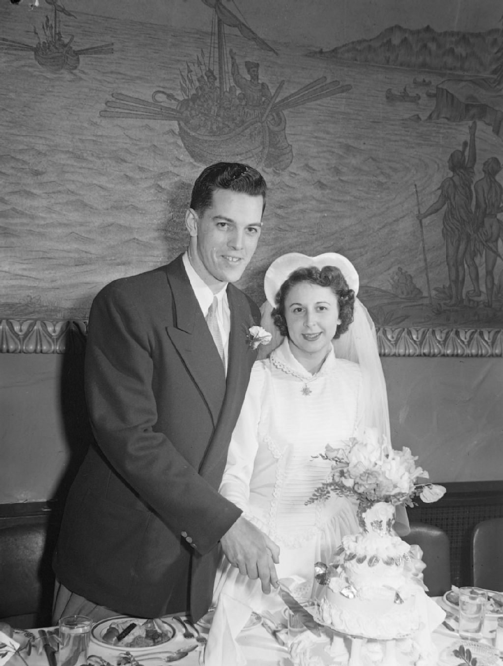 Un couple de jeunes mariés découpent leur gâteau de mariage. Derrière eux, nous remarquons la tapisserie représentant une scène de la découverte du Canada par Jacques Cartier