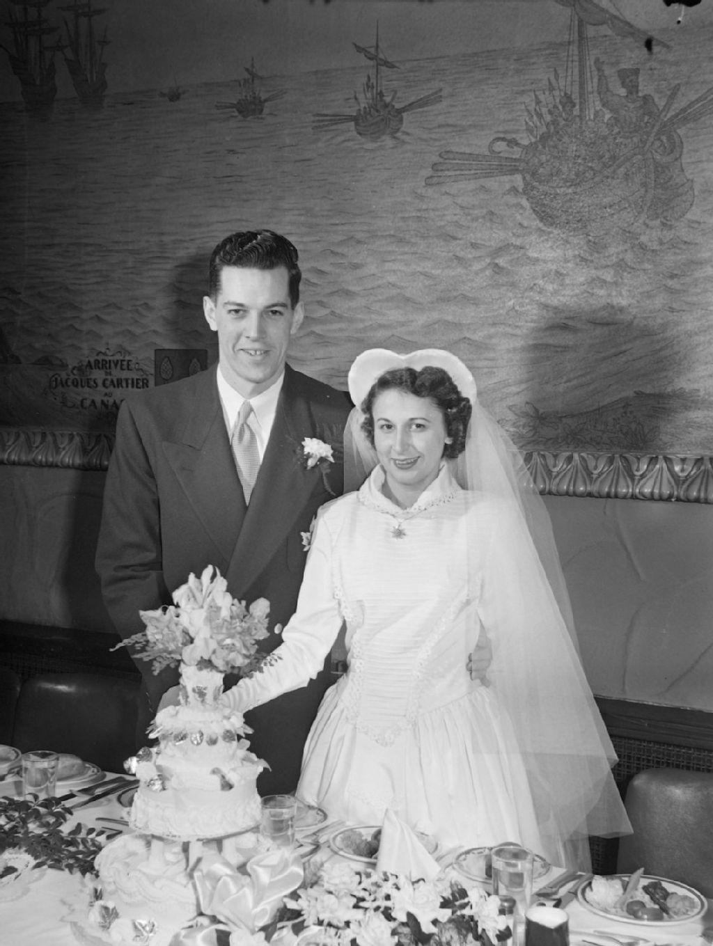 Une couple de jeunes mariés découpent leur gâteau de mariage. Derrière eux, nous remarquons la tapisserie représentant une scène de la découverte du Canada par Jacques Cartier