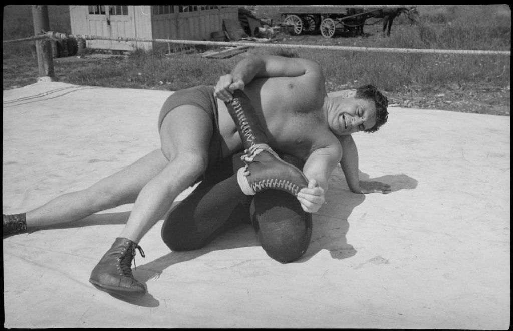 Sur un ring extérieur, nous voyons deux lutteurs le livrant un combat. En arrière-plan, nous apercevons un cheval attelé à une charrette à quatres roues