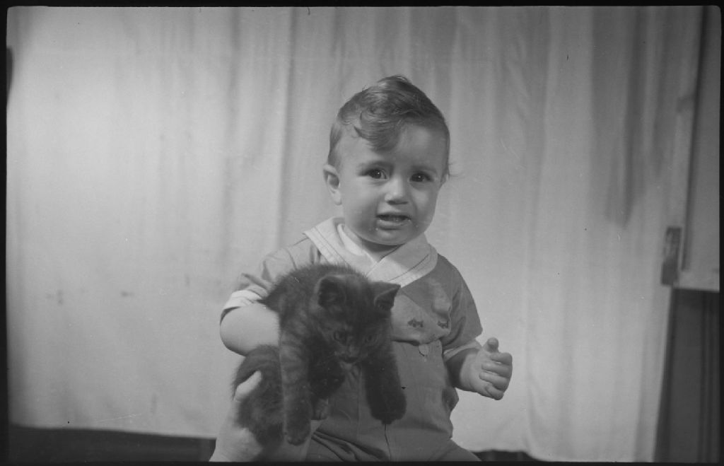 Nous voyons un garçon, âgé d'environ deux ans, assis et tenant sous son bras un chaton