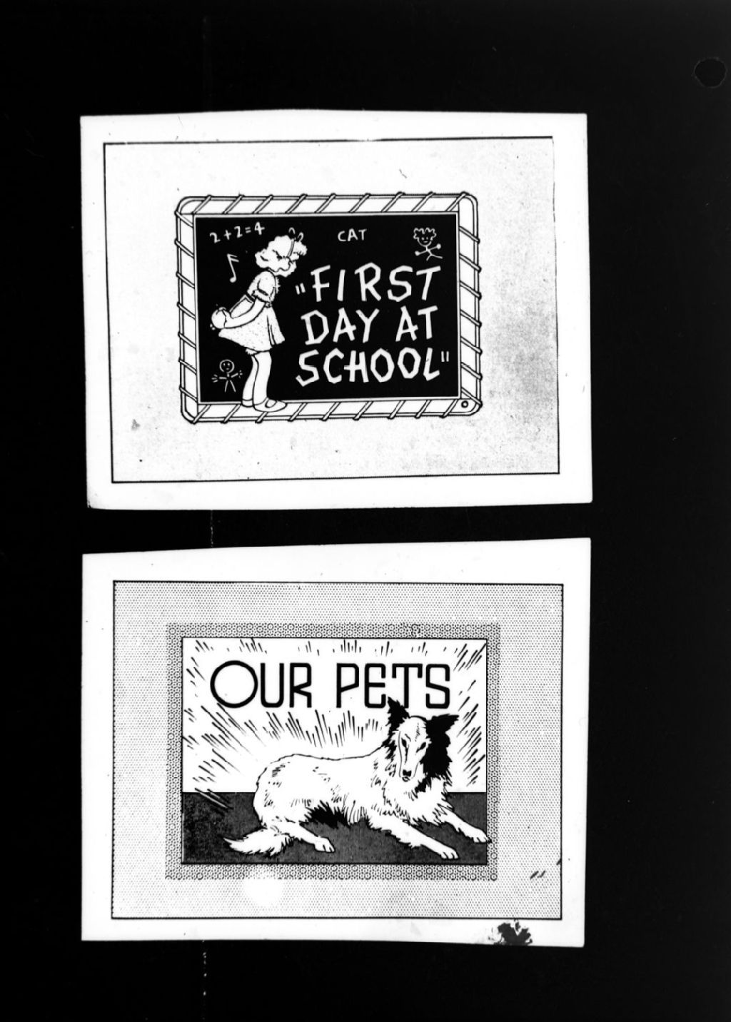 Nous voyons les cartes illustrées «First Day at School» & «Our Pets»
