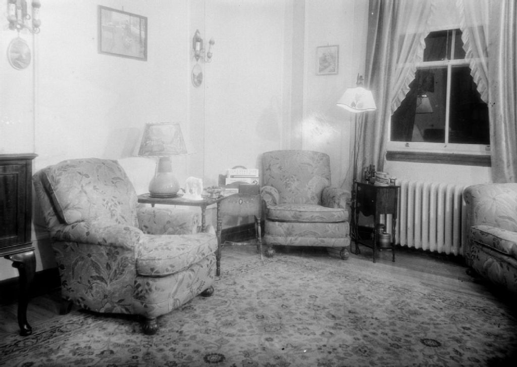 Nous voyons l'intérieur d'un salon dans une maison cossue. Nous apercevons trois fauteuils, un tapis, des tentures, du mobilier divers, un buffet, un calorifère à eau chaude sous une fenêtre. Nous remarquons aussi des bibelots, des lampes et des tableaux