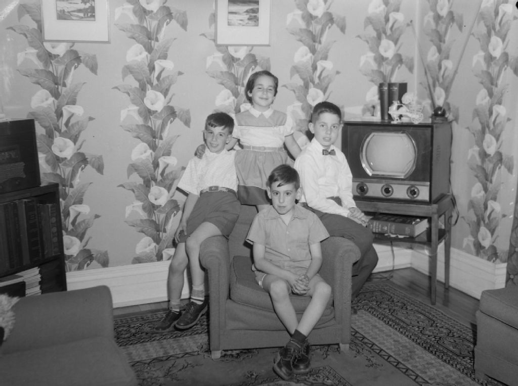Nous voyons les quatre enfants de la famille Hokish assis près du téléviseur