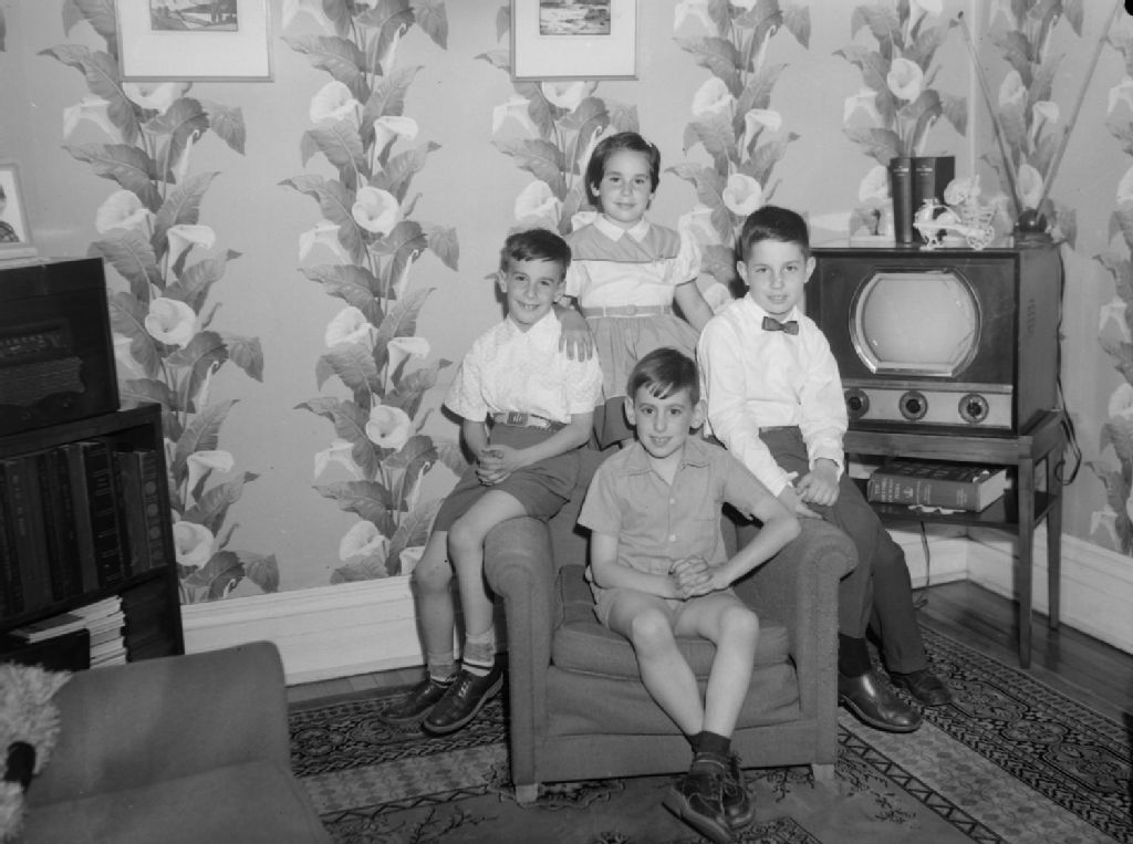 Nous voyons les quatre enfants de la famille Hokish assis près du téléviseur