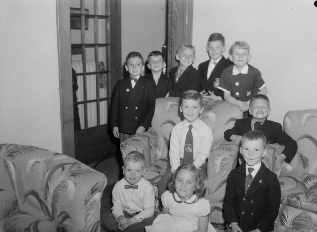 Un groupe de petits garçons et une petite fille sont réunis pour une fête organisée pour Leslie Arter qui habite avenue Wicksteed à Mont-Royal. Un garçon porte une cravate avec un dessin de Davy Crockett