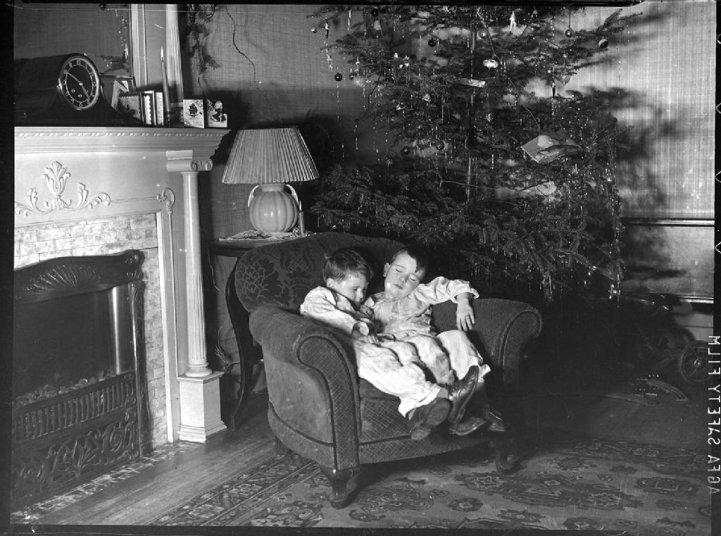 Nous voyons deux garçons endormis assis en pyjama dans un fauteuil près d'un foyer muni d'un pare-étincelles. Nous remarquons sur le manteau de la cheminée une horloge et des cartes de Noël exposées. Nous apercevons derrière le fauteuil un sapin décoré et un tapis à motifs au sol