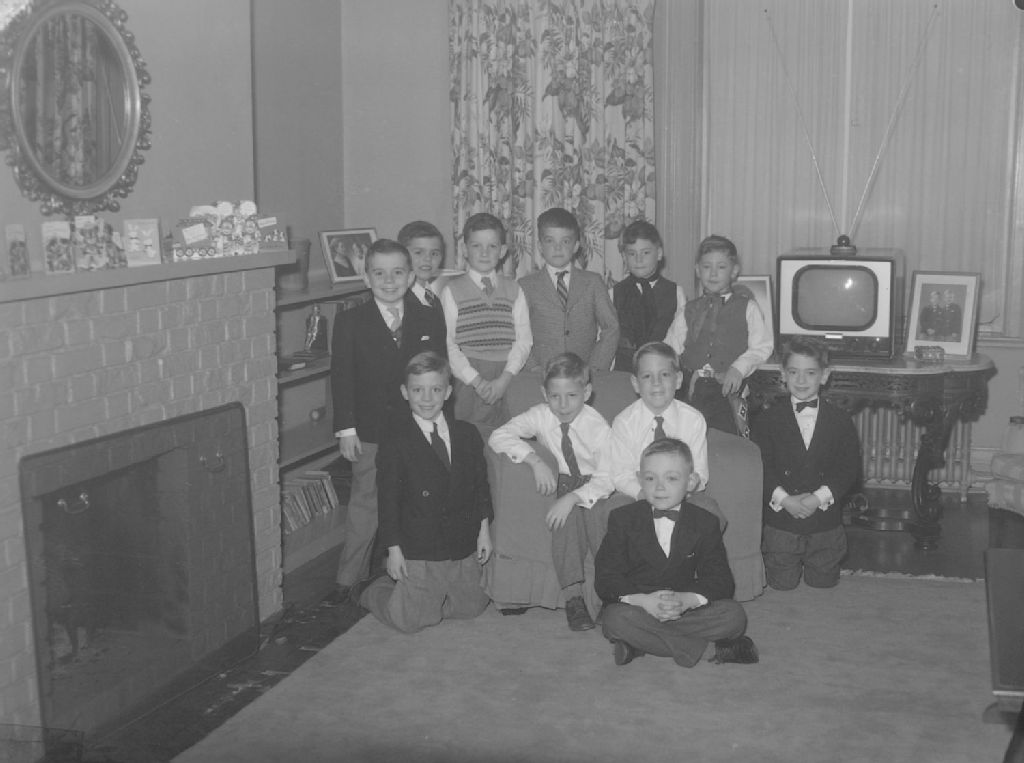 Nous voyons un groupe de garçons réunis lors de l'anniversaire de Pierre et Paul Vincent à la résidence familiale au 351, avenue Lansdwone à Westmount. On remarque, en arrière-plan, une télévision