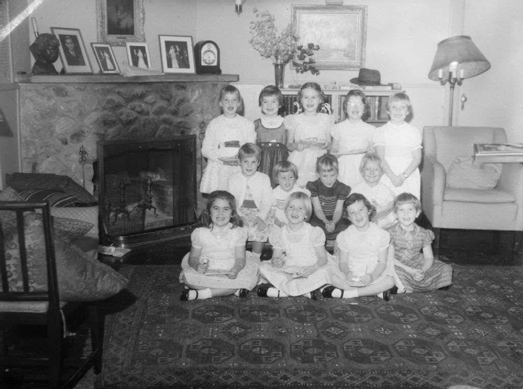 Nous voyons un groupe d'enfants réunis lors d'une fête à la résidence de la famille Hagussen au 4389, avenue Montrose à Westmount. Nous remarquons, à l'arrière-plan, une horloge sur le manteau de la cheminée