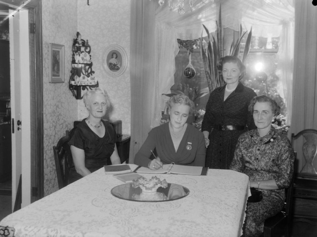 Nous voyons un groupe de femmes réunies à l'occasion d'une rencontre du «NDG Women's Club» au 4625, rue Sherbrooke Ouest à Westmount. Nous remarquons qu'une femme porte un insigne où l'on peut lire l'acronyme «NDGW»