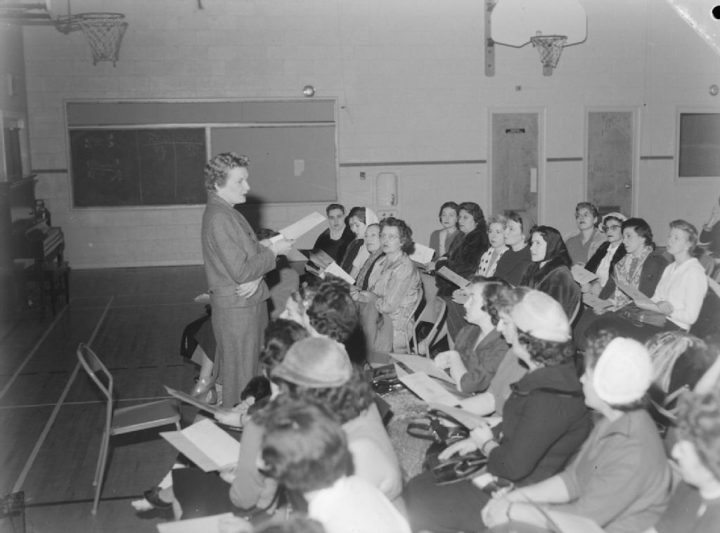 Nous voyons des femmes réunies dans le gymnase de l'école Westminster à Côte-Saint-Luc. Nous remarquons qu'elles tiennent toutes un dépliant