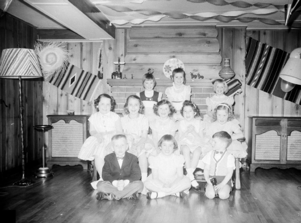 Un groupe de filles et deux garçons sont réunis pour une fête pour Debbie Dexter qui habite avenue Melrose à Montréal. Nous remarquons deux tapis à motifs et un chapeau de paille accrochés au mur