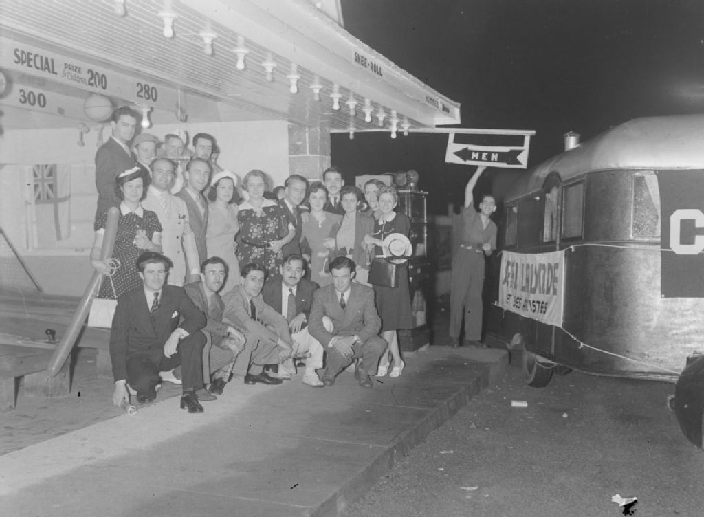 Groupes d'artistes de la station radiophonique C.K.A.C. à Montréal posant avec le chanteur vedette Jean Lalonde (au deuxième plan, troisième à partir de la gauche), père du chanteur Pierre Lalonde, lors d'une sortie. Nous apercevons un autobus garé portant en bannière l'inscription "Jean Lalonde et ses artistes"
