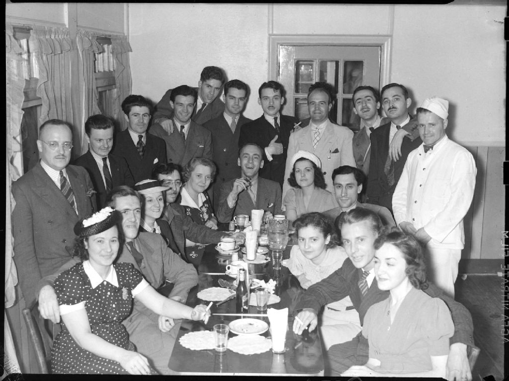 Groupes d'artistes de la station radiophonique C.K.A.C. à Montréal posant autour d'une table présidée par le chanteur vedette Jean Lalonde, père du chanteur Pierre Lalonde, lors d'un dîner au restaurant Frank De Rice à Montréal. Nous apercevons, à sa droite, l'animateur Roger Baulu