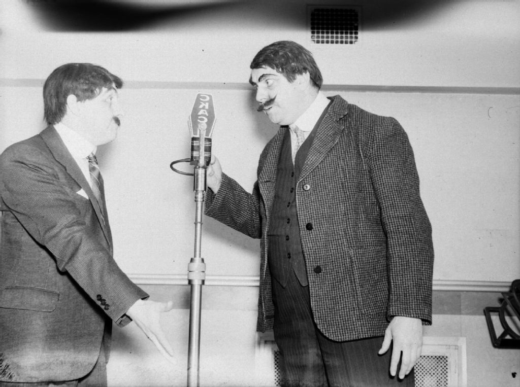 - Deux comédiens-vedettes de l'émission humoristique "Nazaire et Barnabé", dont Ovila Légaré, l'auteur des textes, sont en ondes dans les studios de C.K.A.C., situés au 980, rue Sainte-Catherine Ouest à Montréal