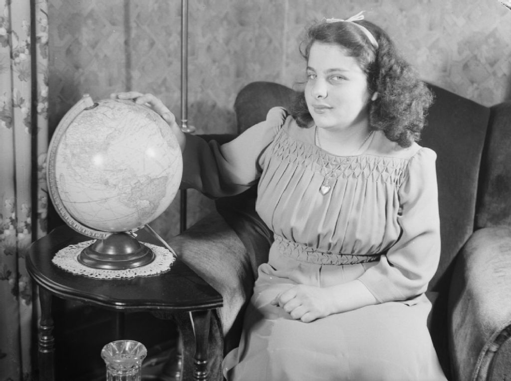 Hélène Bertrand, participante au jeu questionnaire "Questionnaire de la Jeunesse", est assise près d'un globe terrestre. Cette émission est diffusée par C.B.C. à Montréal