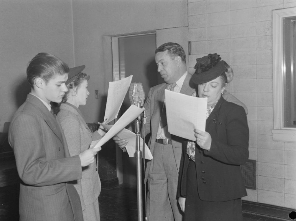 Quatre comédiens, dont Robert Gadouas à l'extrême droite, jouant un scénario de l'émission éducative "Radio Parents" diffusée par C.B.C. (Radio-Canada) à Montréal