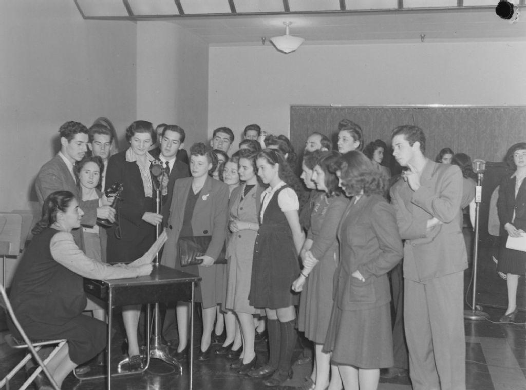 Groupe de jeunes gens debout devant Judith Jasmin lisant un texte assise à une table durant la diffusion de l'émission éducative de C.B.C. "L'École de la radio"