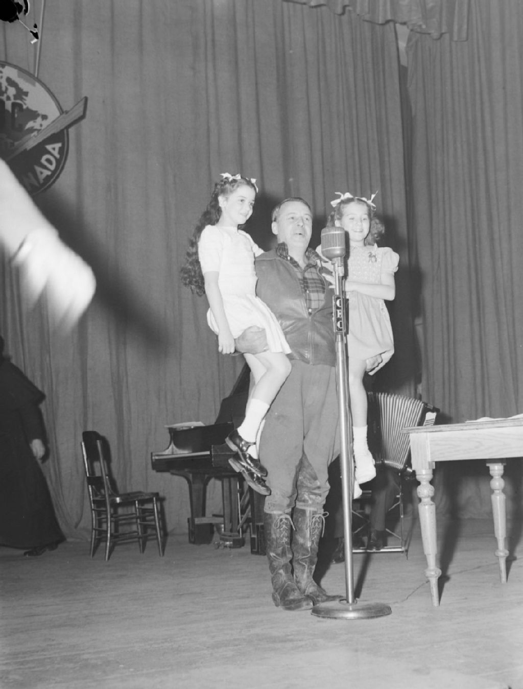 Le comédien Albert Duquesne jouant le rôle de Fred L'Intrépide soulevant deux fillettes dans ses bras lors de l'émission "Samedi Jeunesse" radiodiffusée par la station C.B.C. à Montréal