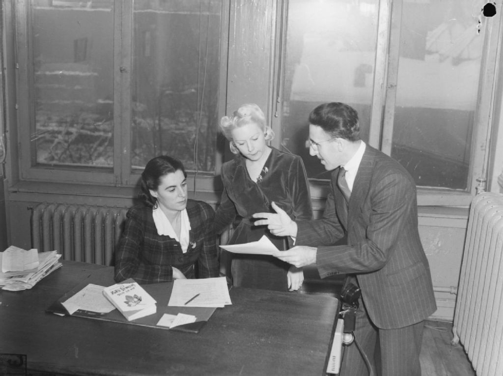 Trois collaborateurs de l'émission radiophonique « Notre français sur le vif » diffusée par C.B.C. à Montréal. Nous apercevons la réalisatrice Judith Jasmin discutant avec le professeur Jean-Marie Laurence devant la comédienne Olivette Thibault