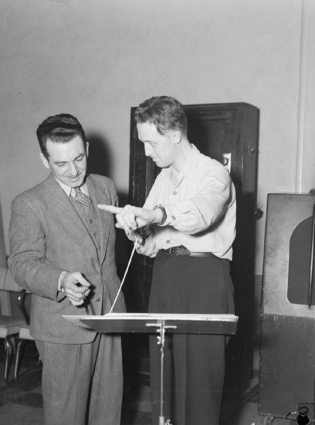 L'animateur Marcel Henri discutant avec le chef d'orchestre Jean Deslauriers dans un studio de la station C.B.C. à Montréal