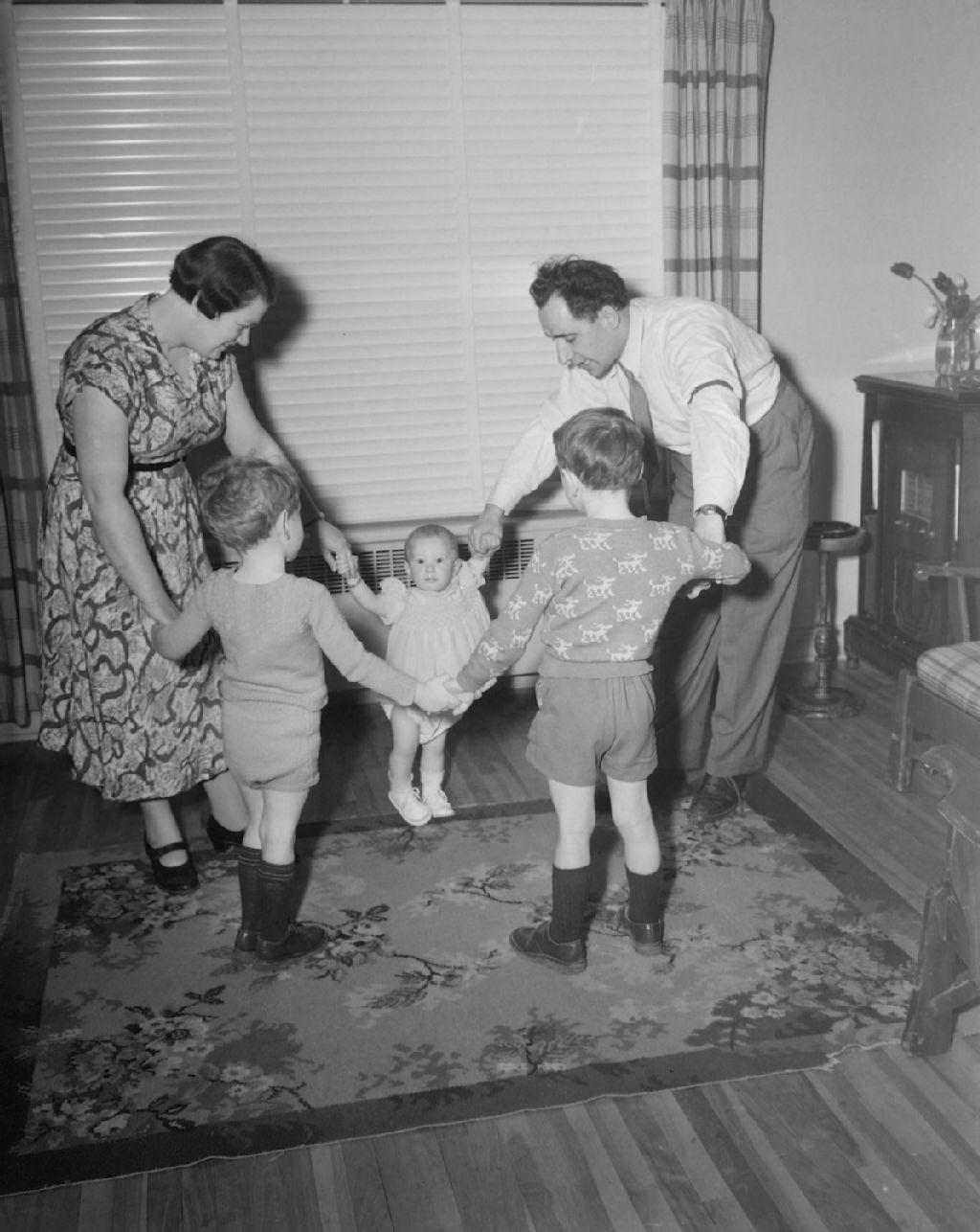 Nous voyons l'annonceur à Radio-Canada Raymond Laplante, sa femme Madeleine Morin et leurs enfants Pierre, Bernard et Monique. Cette photographie a été publiée dans l'hebdomadaire « Radiomonde »