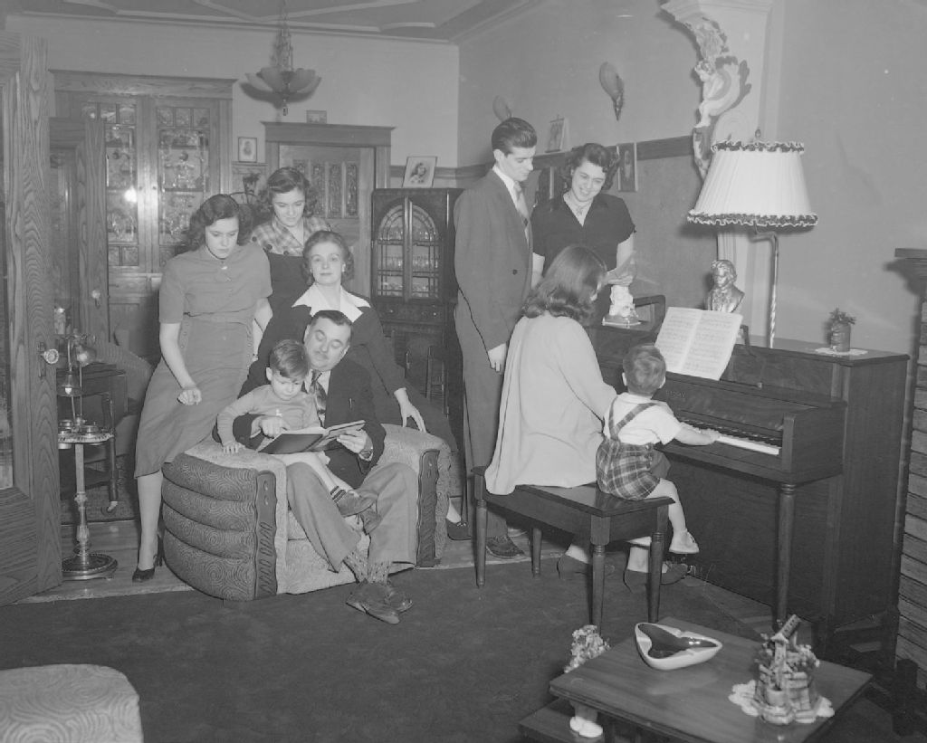 Nous voyons Ovila Légaré, sa femme Émilia Deguire, leurs filles Pierrette, Raymonde et Francine, leur fils Jean-Pierre et sa femme Louise Deslauriers assise au piano à côté de leur fils André. Ovila Légaré lit un livre à son petit-fils Jean-Pierre. Cette photographie a été publiée dans l'hebdomadaire « Radiomonde »