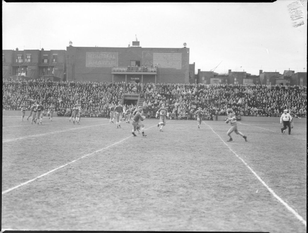 Nous voyons les joueurs des équipes de football «Westmount» et «WestHill» en uniforme, s'affrontant lors d'un match sur un terrain entouré d'une clôture métallique. Nous apercevons, derrière, un édifice avec une affiche indiquant «Tea Room» et un immense panneau portant l'inscription «Montreal Amateur»