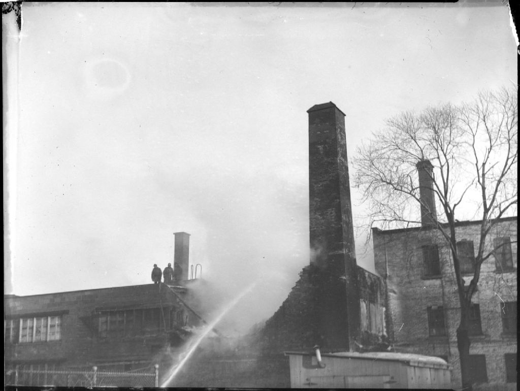 Nous voyons une partie de l'édifice de la «Standard Felt Company», 1012 rue Saint-Urbain à Montréal, touché par un incendie. Nous apercevons un jet d'eau tentant d'éteindre le feu