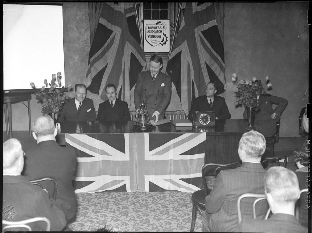 Un conférencier devant la Chambre de commerce de Westmount. Derrière la table d'honneur, nous remarquons deux drapeaux «Union Jack» de même que le slogan «Geared for Better Business»