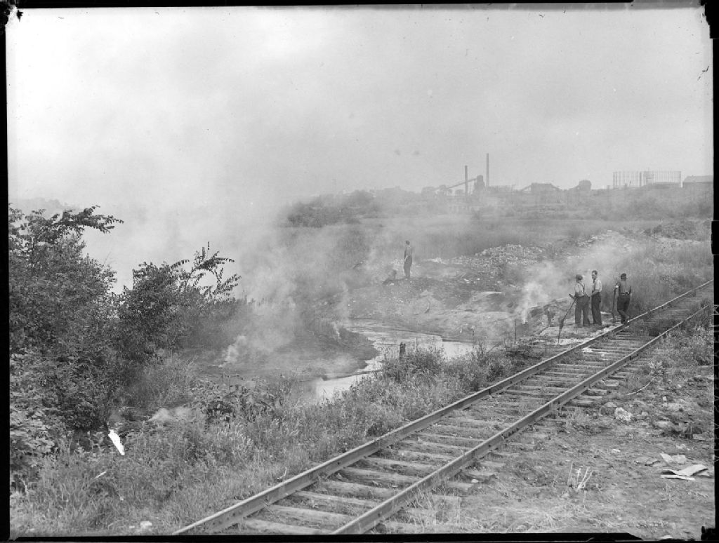 Trois hommes munis de pelles près d'une voie ferrée, tentant de circonscrire un incendie à la «Canada Car»