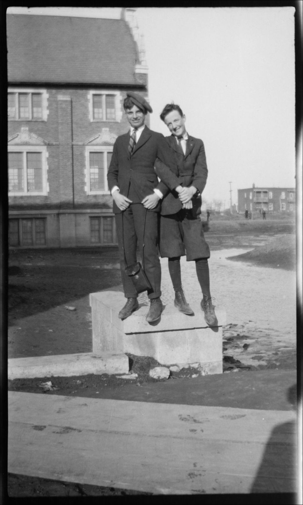 Négatif non réclamé. Deux adolescents (dont un porte des «britches») debout devant un édifice en pierre. Les personnes représentées semblent être des étudiants
