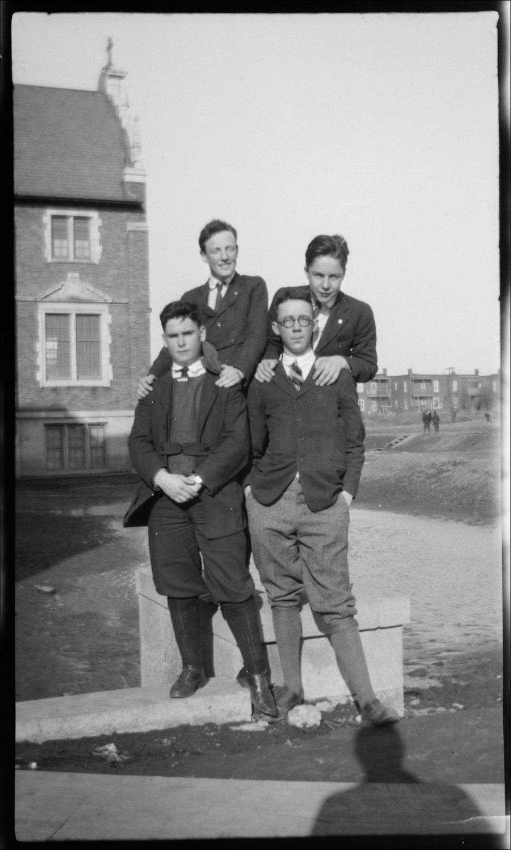 Négatif non réclamé. Quatre adolescents (dont deux portent des «britches») debout devant un édifice en pierre. Les personnes représentées semblent être étudiants