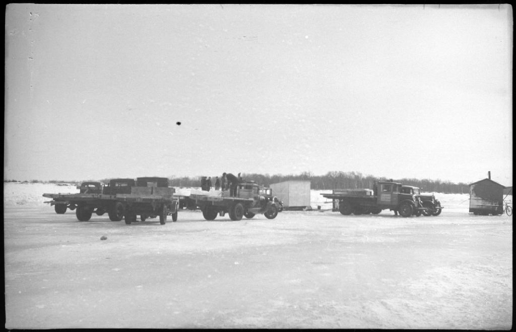 Lors d'une opération de coupe de glace sur les battures du fleuve Saint-Laurent, nous voyons plusieurs camions pour le transport de la glace. Nous apercevons des hommes plaçant des cubes de glace sur les plate-formes de transport des camions