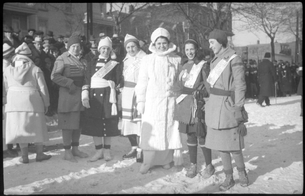 Lors d'une rencontre de raquetteurs au Parc Lafontaine à Montréal, nous voyons la reine des raquetteurs, vêtue d'un manteau de fourrure, entourée de quatre autres candidates en costume portant en bandouillère l'inscription «Demoiselle d'honneur»
