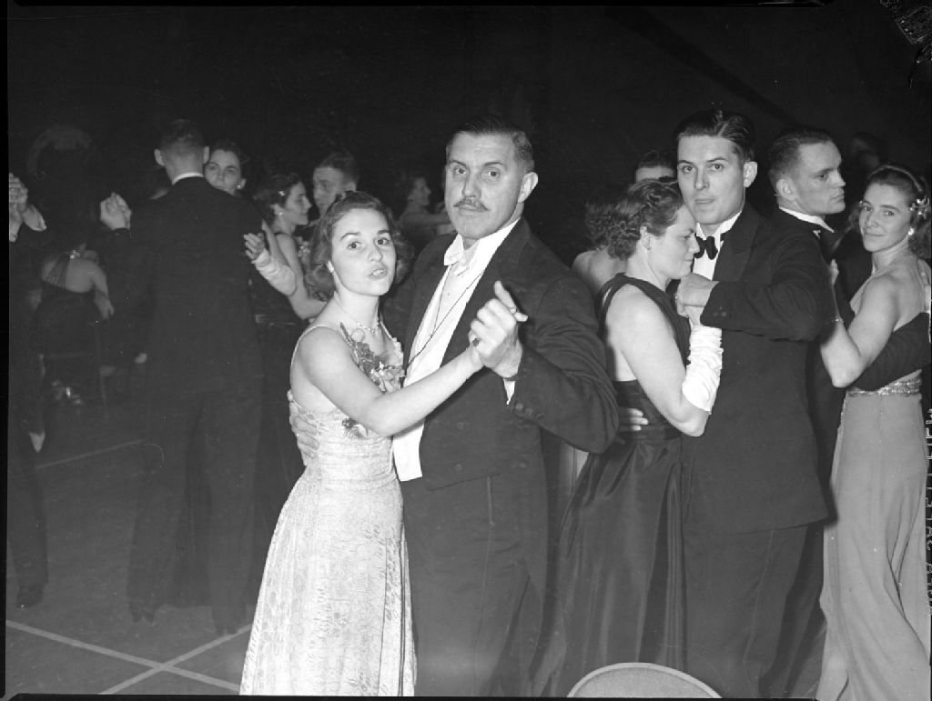 Lors d'une danse organisée pour une soirée d'Halloween, nous voyons des couples évoluant sur la piste dont, à l'avant-plan, mademoiselle Phoebe Ann Freeman en robe de soirée et monsieur G.R. Forenet en tuxedo et lavallière