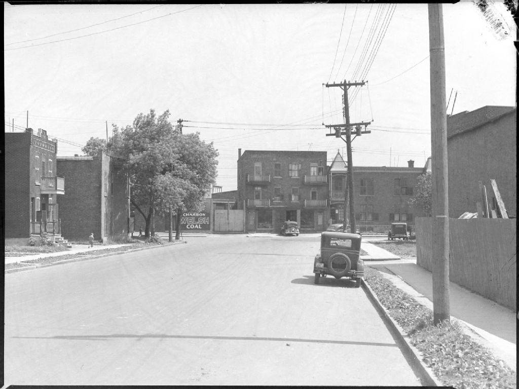 Nous voyons l'avenue Western à l'angle de l'avenue Prud'homme dans Notre-Dame-de-Grâce à Montréal. Nous apercevons une automobile garée sur l'un des côtés de l'avenue et une enseigne annonçant la marque de charbon «Welsh Coal»