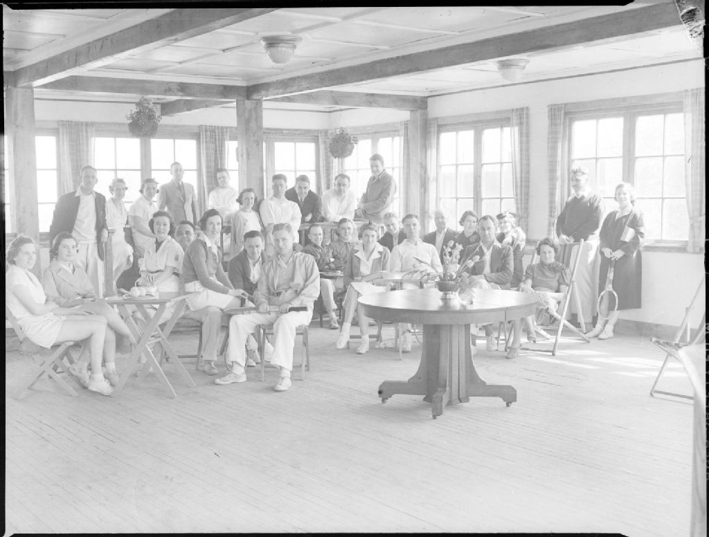 Nous voyons les membres d'un club de tennis de Notre-Dame-de-Grâce à Montréal posant assis autour de tables, en costume de sport à l'intérieur d'un chalet aux nombreuses fenêtres