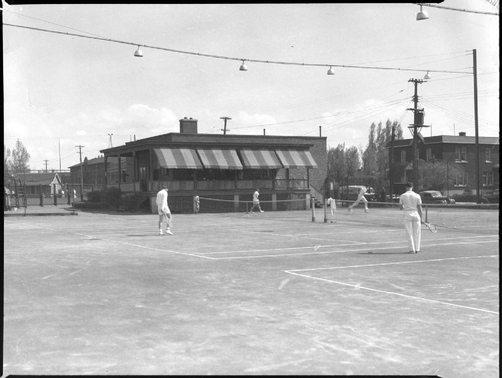 Nous voyons des joueurs de tennis du «M.A.A.A. Tennis Club», évoluant en tenue sport sur un court de tennis dans Notre-Dame-de-Grâce à Montréal. Nous apercevons, derrière, des maisons