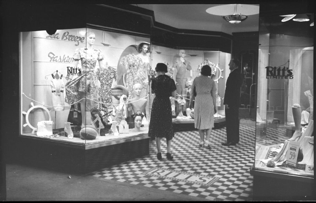 Nous voyons la façade de la boutique de mode féminine «Ritts», située au 97, rue Rideau à Ottawa, avec des mannequins en vitrines revêtus des nouveautés de la maison. Nous apercevons aussi des présentoirs en forme de têtes, de bustes et de jambes servant à l'exposition des articles de mode. Nous remarquons devant l'entrée trois clients, deux femmes et un homme