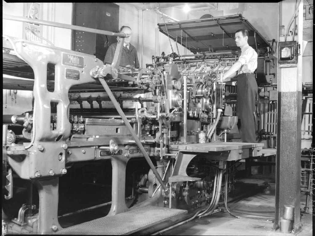 Nous voyons un appareil typographique de marque Miehle manoeuvré par deux ouvriers debout sur une plate-forme dans les locaux du journal La Samedi, situé au 975, rue de Bullion à Montréal