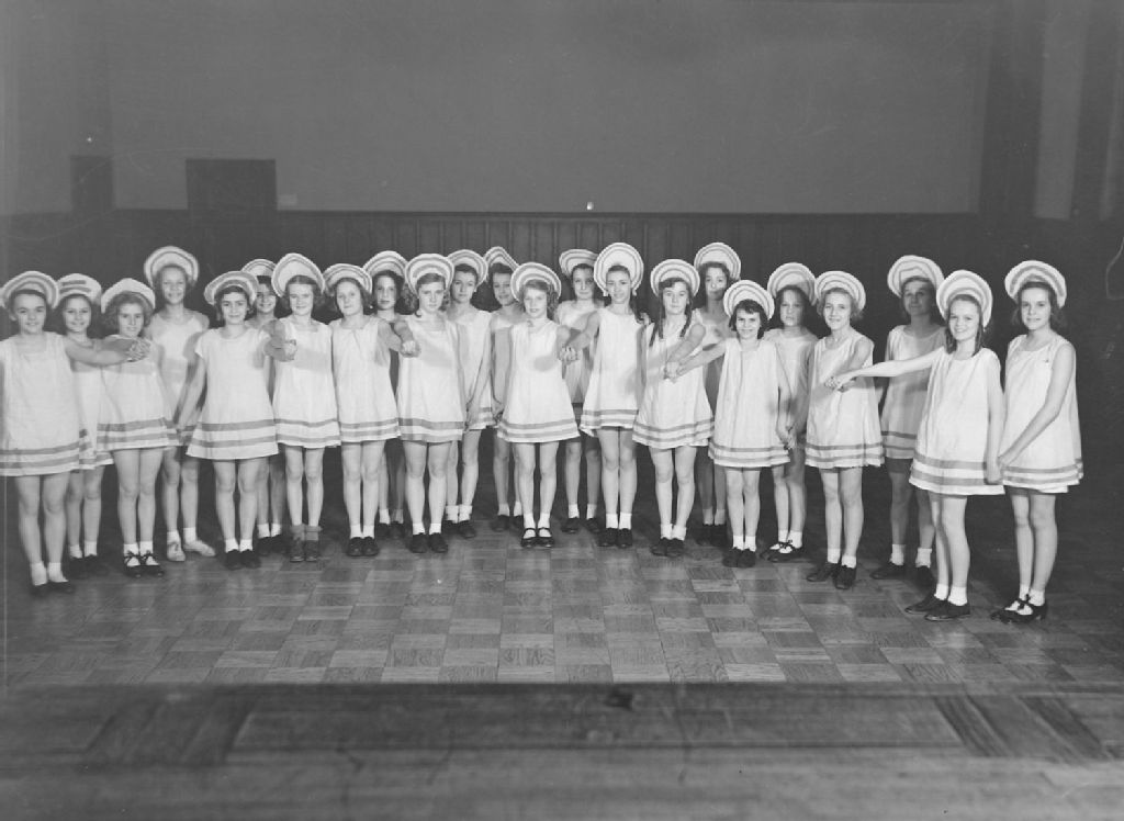 Nous voyons un groupe de fillettes en robes courtes et chapeaux, dans les locaux du «Southwestern Y.M.C.A.», avenue Gordon à Verdun, lors d'un spectacle de danse pan-canadien. Cette troupe exécutait des gigues