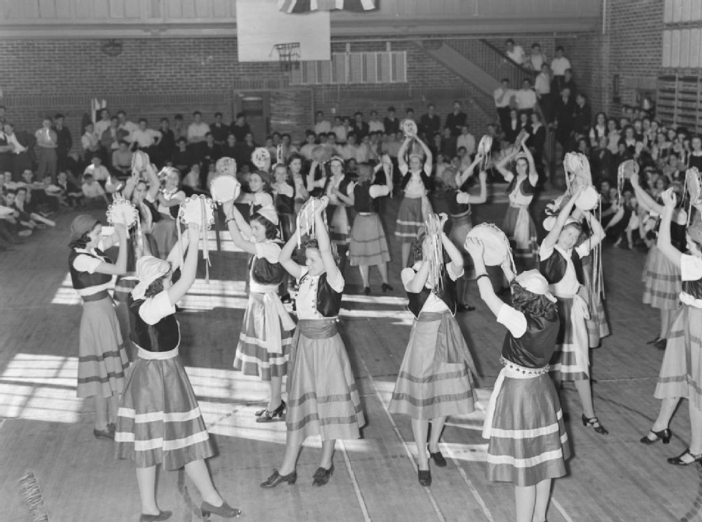 Nous voyons la troupe de danse folklorique ukrainienne «Katerana» formée de jeunes filles vêtues de costumes traditionnels, exécutant une danse avec des tambours de basque dans les locaux du «Southwestern Y.M.C.A.», avenue Gordon à Verdun, lors d'un spectacle de danse pan-canadien. Nous apercevons des spectateurs à l'arrière-plan