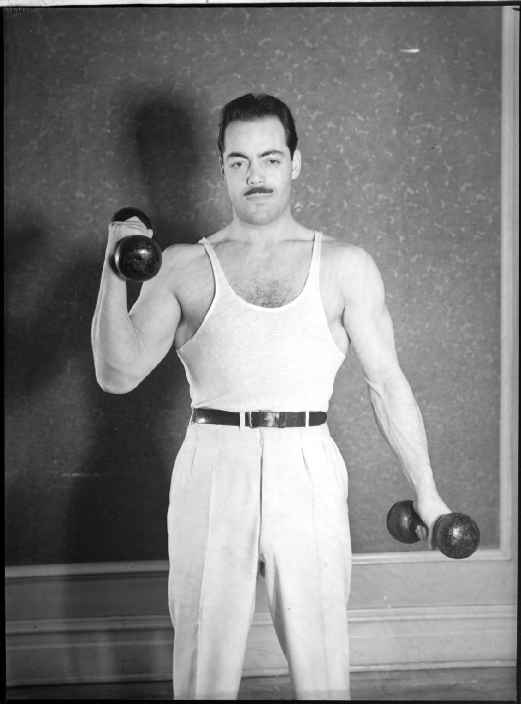 Nous voyons un homme du nom de Jacques Langevin vêtu d'une camisole, exécutant des exercices d'haltérophilie debout en soulevant à bout de bras des poids