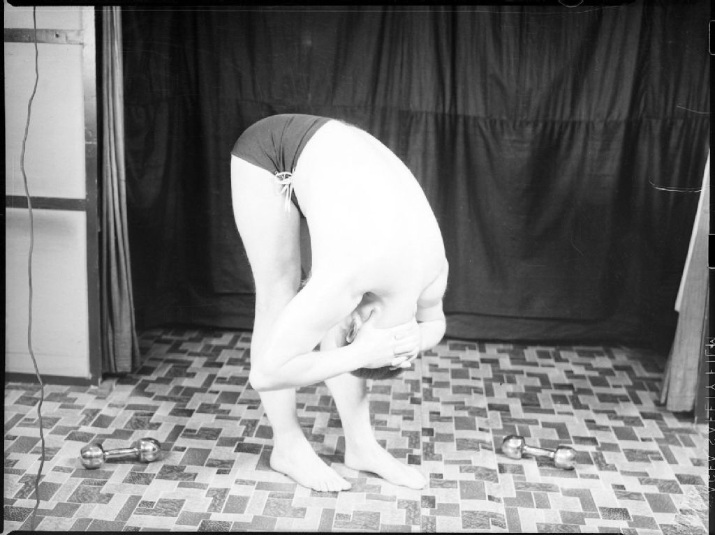 Nous voyons un homme du nom de Yvan Coutu vêtu d'un maillot, torse nu, exécutant des exercices de gymnastique devant une toile de fond : il se tient debout mais torse plié, tête aux genoux et bras derrière la tête