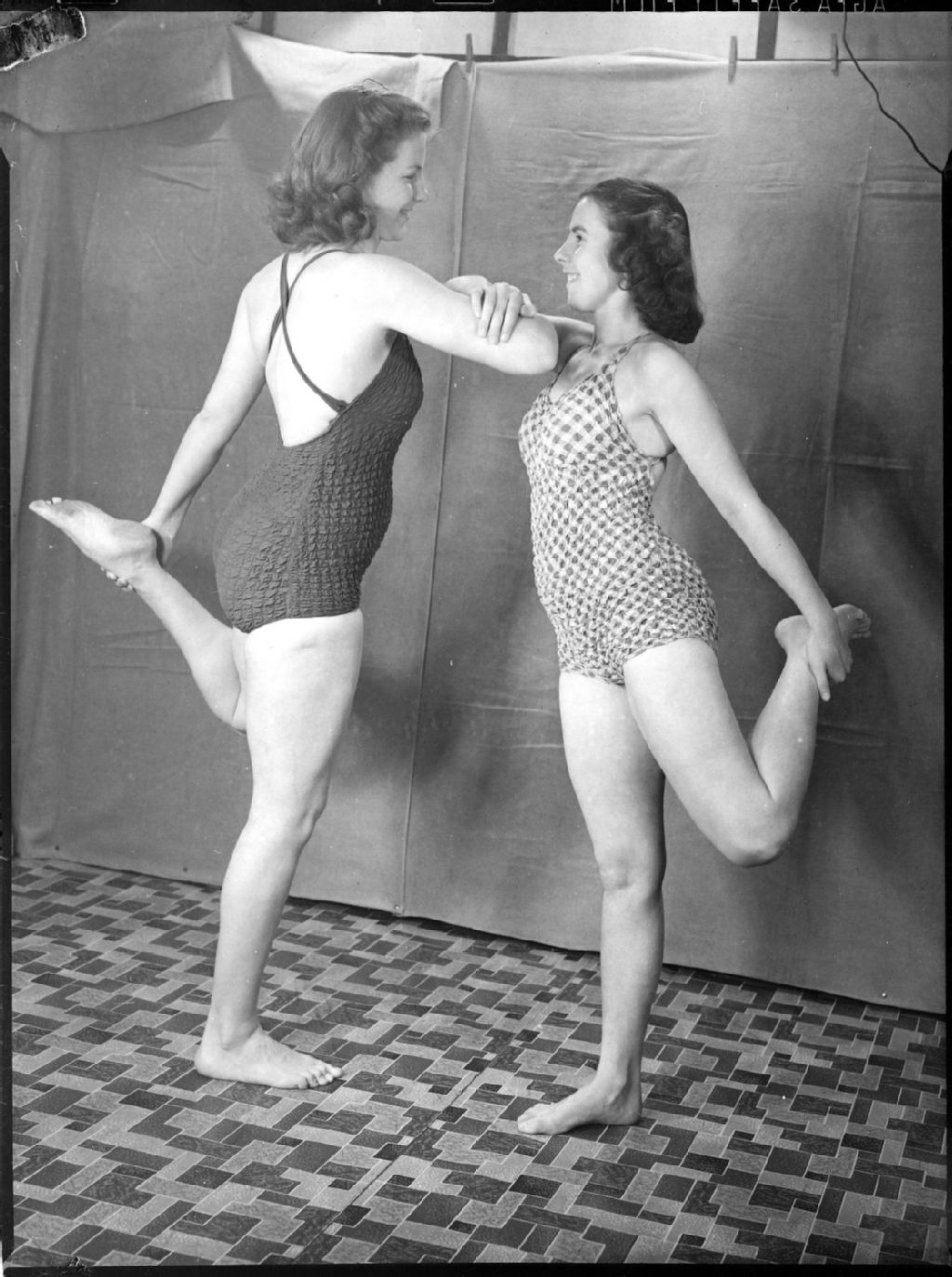 Nous voyons deux jeunes filles posant debout sur un seul pied, en maillot de bain devant une toile de fond. Elle sont appuyées coude à coude tout en tenant l'autre jambe repliée et tentant de déstabiliser l'adversaire
