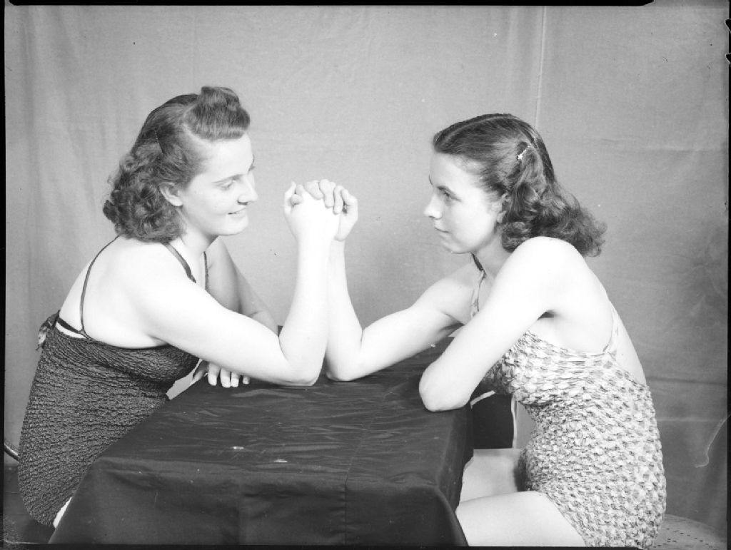 Nous voyons deux jeunes filles du nom de Eileen Greenwood et Frances Burroughs, en maillot de bain, jouant au bras de fer sur une table