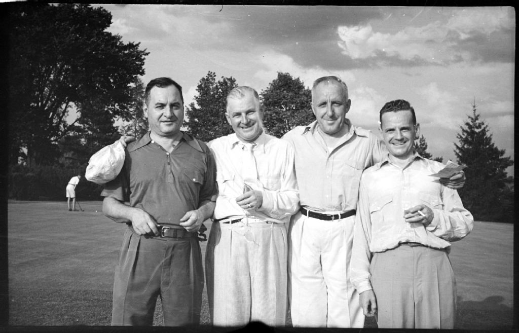 Lors d'un tournoi de golf organisé par le Club canadien à Laval-sur-le-Lac à Laval, nous voyons posant debout devant un boisé quatre participants se tenant par les épaules