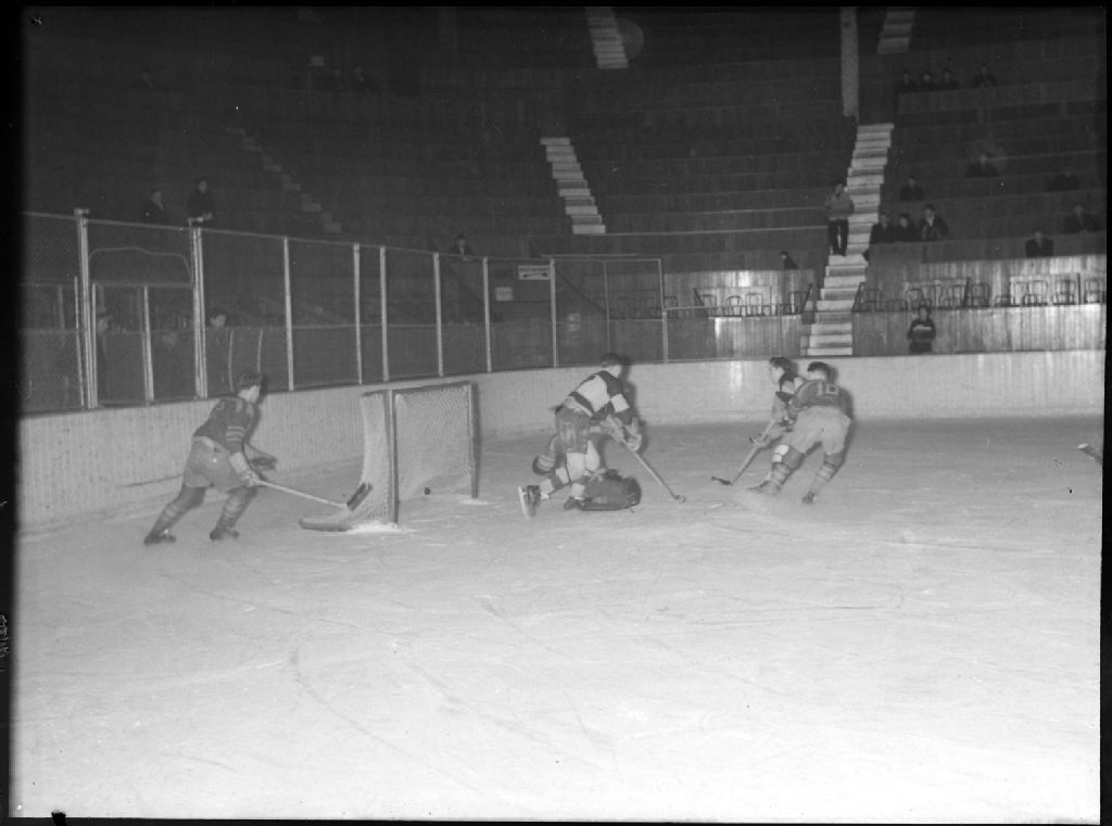 Nous voyons des adolescents jouant au hockey sur une patinoire intérieure. Il s'agit de jeunes de la «West Hill High School» de Montréal et de la «Westmount High School Academy» de Westmount. Westmount vient de compter un 3e but en 2e période