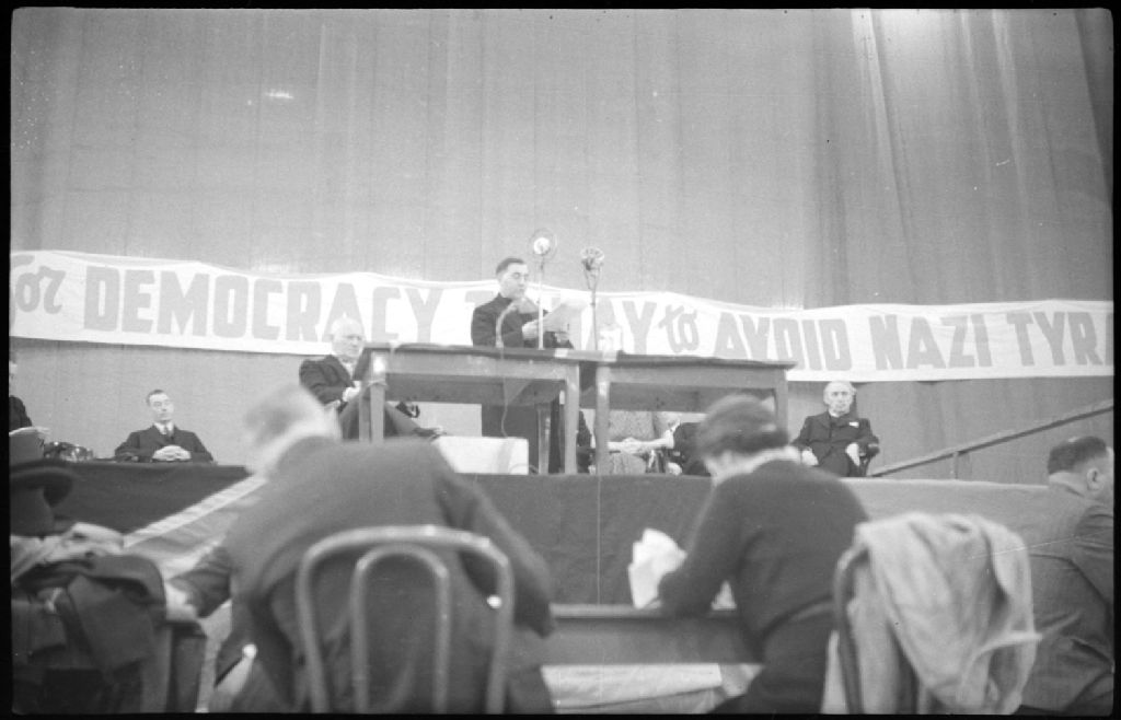 Nous voyons le révérend J. Ostermann prenant la parole lors d'un ralliement organisé au Forum de Montréal par une ligue germano-canadienne anti-nazie. Une banderole au-dessus des orateurs-invités porte l'inscription «The German-Canadian League Fights for Democracy To-day to Avoid Nazy Tyranny To-morrow»